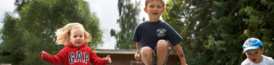 Ein Trampolin (4,3 m) für Groß und Klein lädt zum Hüpfen ein.